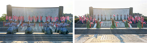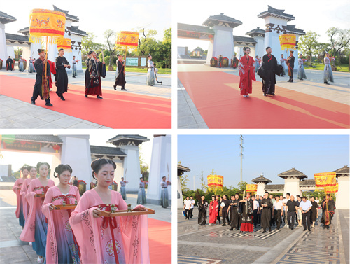 “泗水王劉靖”“婕妃”以諸侯之禮歡迎賓客,儀仗肅立、華蓋蔽日,再現興盛時期“大漢酒國”的榮耀與威儀?;貑T工依諸侯禮節表演了六佾文舞,彩帶紛飛、古韻十足,展現了“仁義禮智信”的中華正統文化精髓。