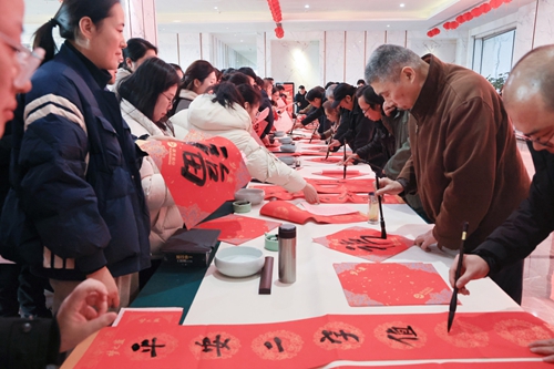隨著蛇年春節(jié)腳步臨近,活動期間還舉辦了“文化惠民”活動,江蘇省當代藝術(shù)創(chuàng)作研究會的文化學者揮毫潑墨,寫對聯(lián)、送福字,為大家送來了新年的祝福。